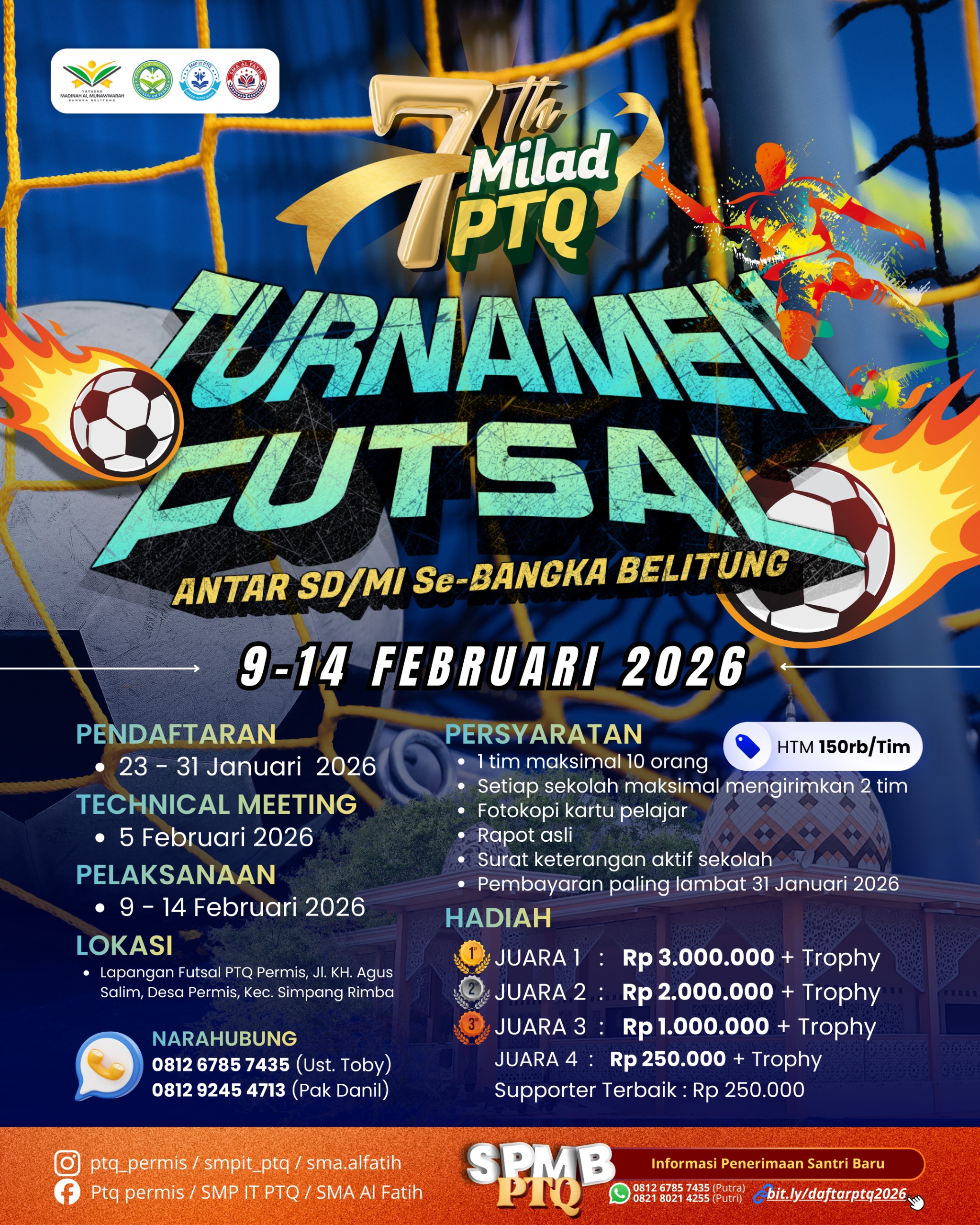 Tempat : Lapangan Futsal PTQ Tanggal : 09 Feb 2026 - 14 Feb 2026 Waktu : 08.00 s/d Selesai